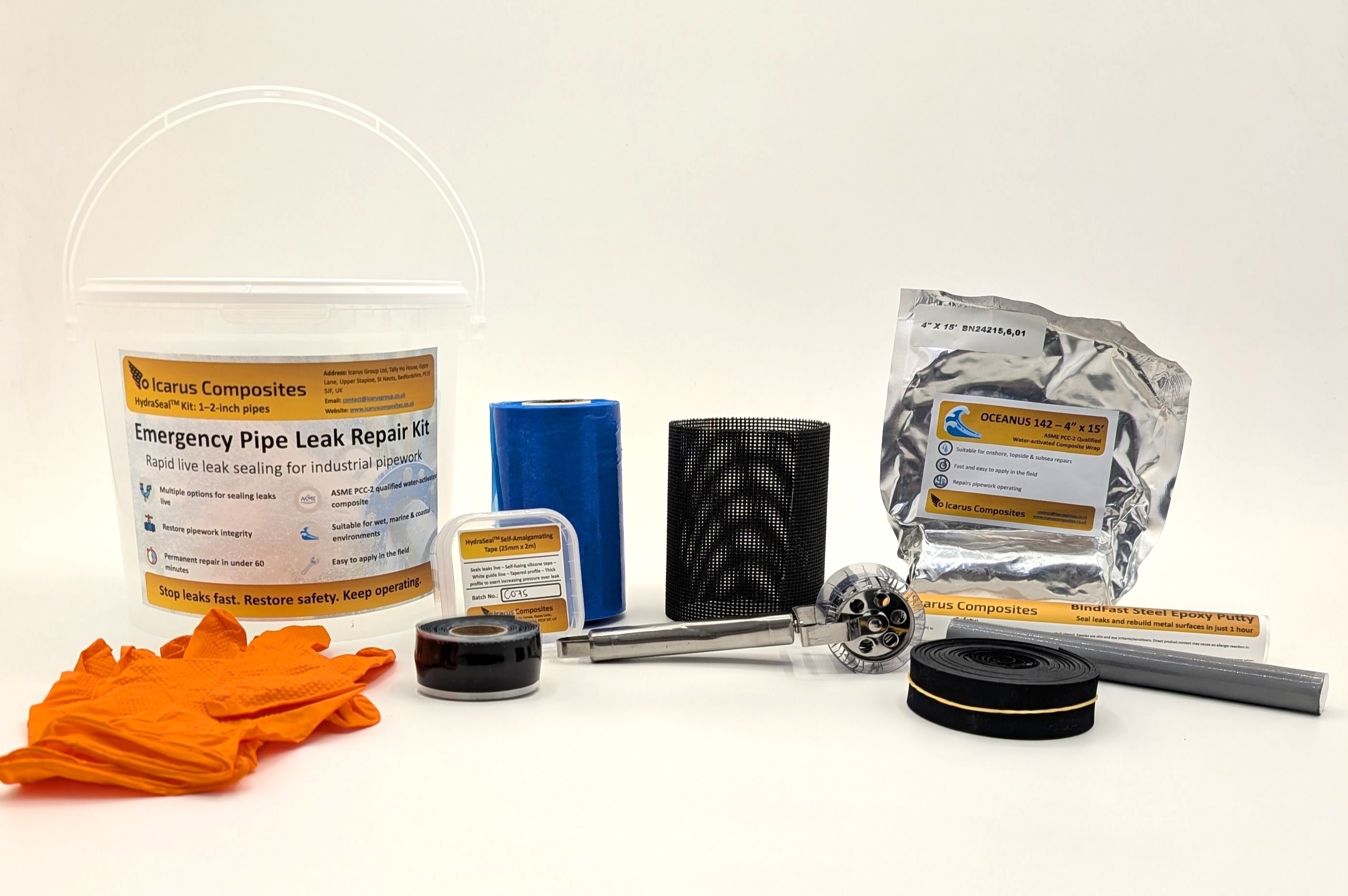 The HydraSeal Emergency Pipe Leak Repair Kit is a ready-to-deploy product that can be purchased, stored on-site, and installed by trained client personnel to rapidly stabilise leaking pipework. Icarus Composites provides formal training and certification, ensuring safe and effective use under live conditions.