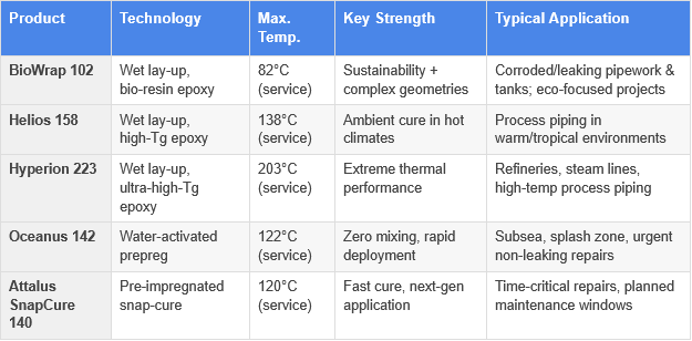 Refineries and petrochemical facilities combine high-temperature, high-pressure process streams with a chemical environment that attacks conventional coatings and accelerates corrosion. Hot work on process piping in classified hazardous areas is subject to strict controls, a factor that makes no-hot-work composite repair particularly attractive. Systems with higher glass transition temperatures (Tg), such as Helios 158 (Tg 158°C) and Hyperion 223 (Tg 223°C), are designed specifically for these environments, providing thermal stability well above the operating temperature of the repaired line.