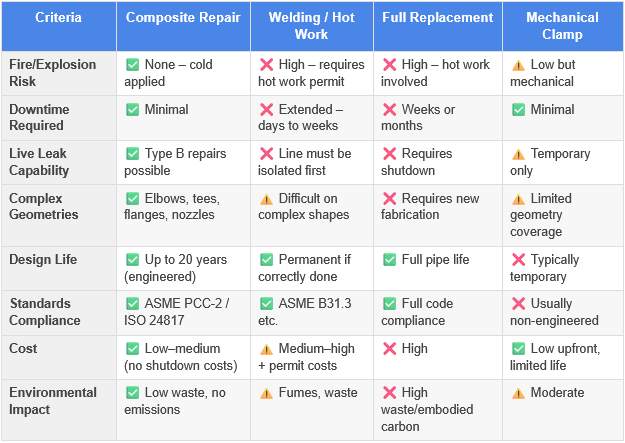 Composite repairs offer a fundamentally different approach. Engineered fiber-reinforced polymer wraps are applied cold, bond directly to the substrate, and restore hoop strength, pressure containment, and structural integrity to corroded or damaged pipework. All this is done without heat, without extended shutdown, and, where qualified systems are used, in full compliance with ASME PCC-2 and ISO 24817. When designed correctly, composite repairs are permanent engineered interventions capable of extending the operational life of an asset by up to 20 years.